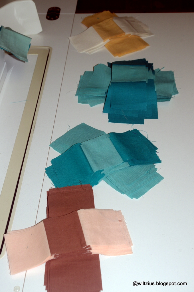 I came downstairs early in the afternoon and started going through the bucket. I'm not only sewing the strips but I'm cutting them, and sewing them into 9 patches.