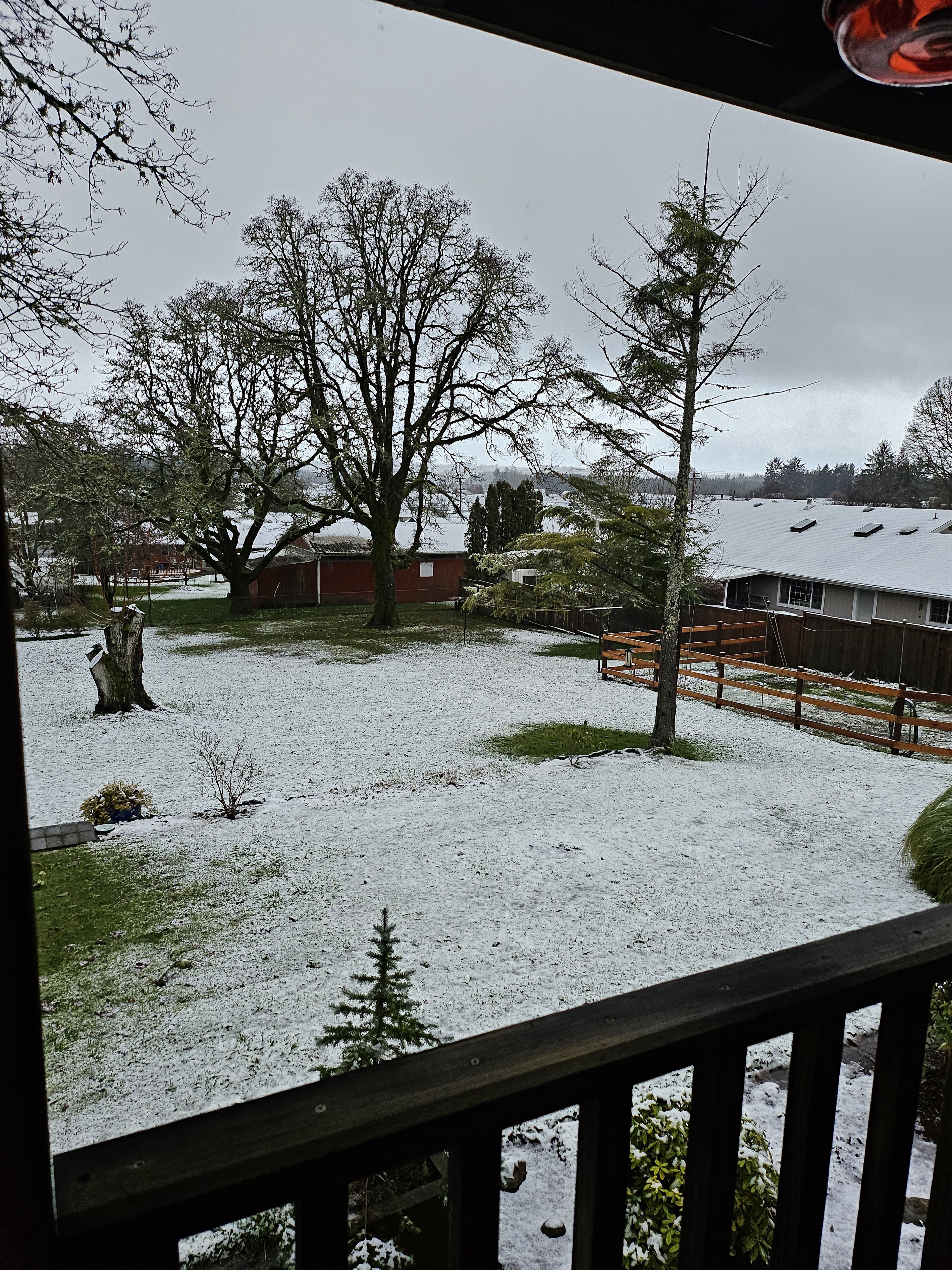 It was a cold day today with the snow. We got snow again today. Mom didn't get much in Centralia but Chehalis and Onalaska got hit pretty good with snow. Wonder if we will have more tomorrow. The state is under a "warning."